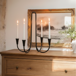 The Meridian Candle Holder strikes a balance between simplicity and sculpture. Its clean, linear form with graceful arcs is designed to hold multiple taper candles, creating an elegant centerpiece that feels both modern and timeless. Hand-forged from metal, it celebrates artisanal craft while offering a versatile silhouette that works in contemporary, rustic, or minimalist spaces.